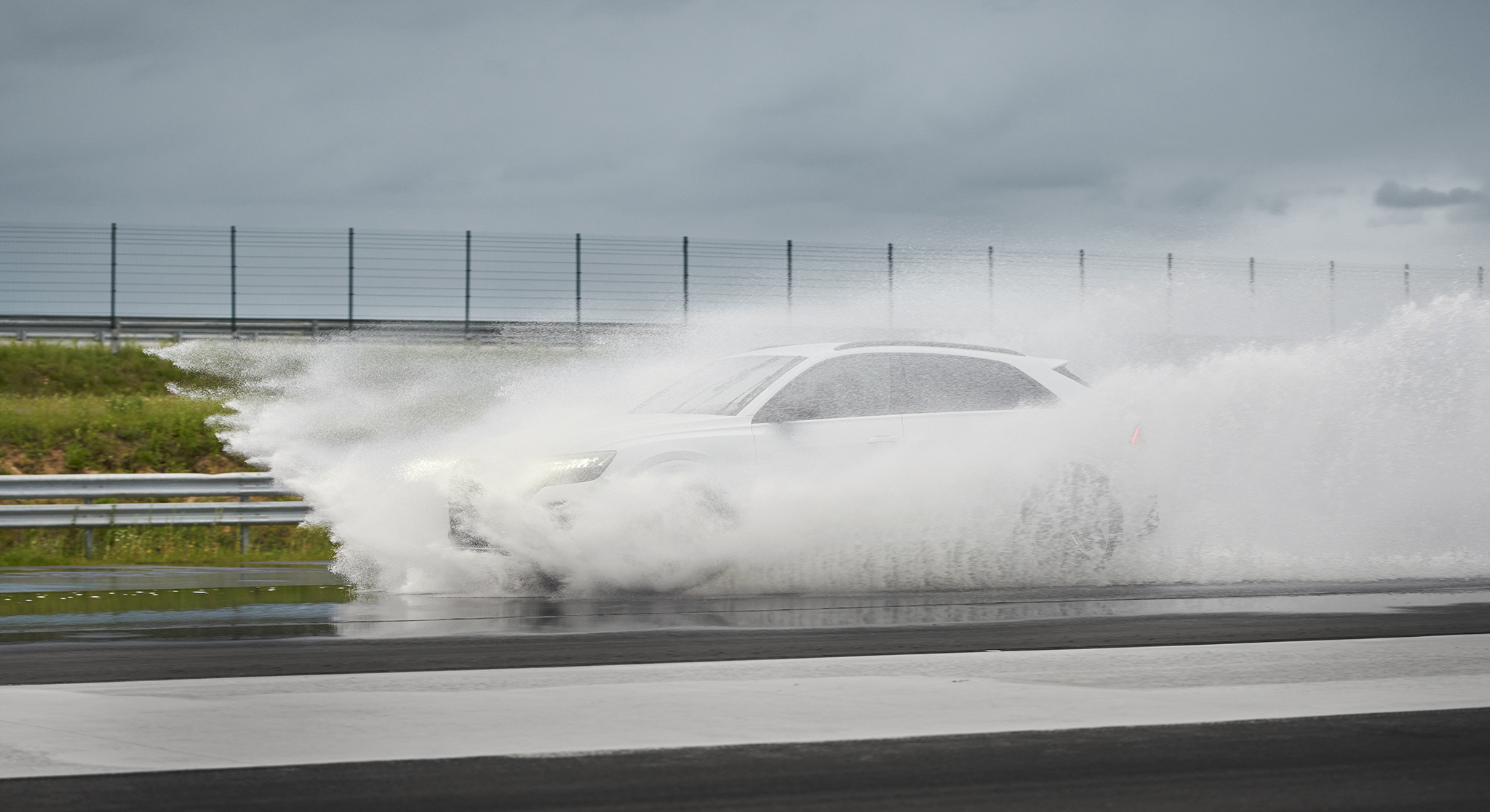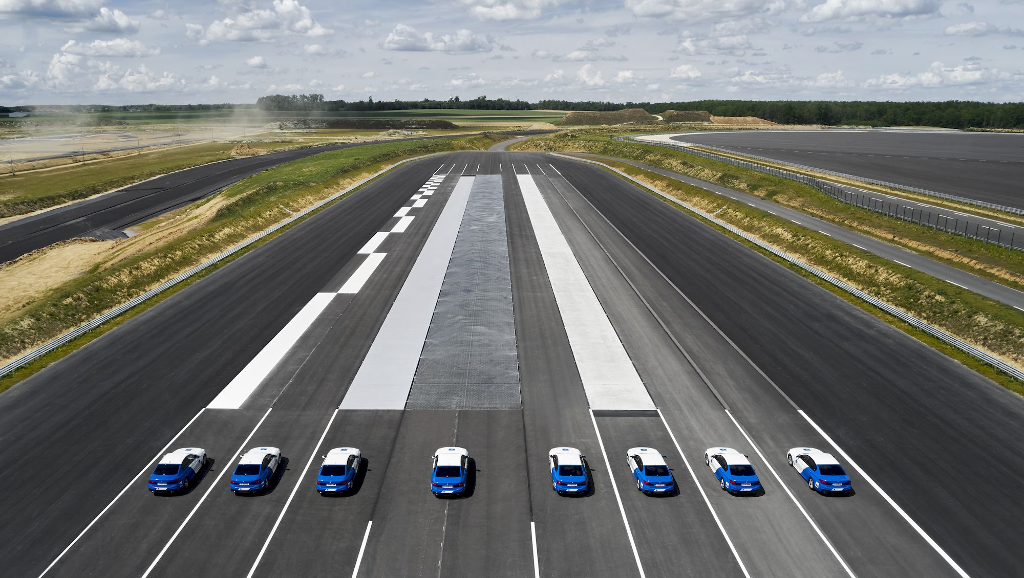 The braking platform is brand new and one of the best in Europe showing the following physical characteristics: total length of 1100m including 750m acceleration lane, 200m braking surfaces, and a safety zone of 150m. The 200m braking surfaces are separated into 8 different lanes: a chess-board surface of altering asphalt & white epoxy resin, rough asphalt µ =~1 (optional wet), low friction(Japanese tiles) µ =~0.1 (wet), blue basalt µ =~0.3 (wet), asphalt µ =~0.8 (optional wet), polished concrete µ =~0.6 (wet), asphalt µ =~0.8 (reserve surface), and an aquaplaning basin (max. 5cm wet depth). Each lane can be watered individually. The Lanes are 4.5m wide with the exception of the blue basalt, which is 8m wide. On each side of the braking platform is a 20m wide asphalted run-off-area. The entire module has a 80cm basalt base/foundation allowing vehicles up to 40t to be tested. Furthermore the braking platform includes a return lane with various permanent road paint / markings for road edge testing and an additional exit at the end of the safety zone. This connects to the motorway module allowing for multi-module testing.